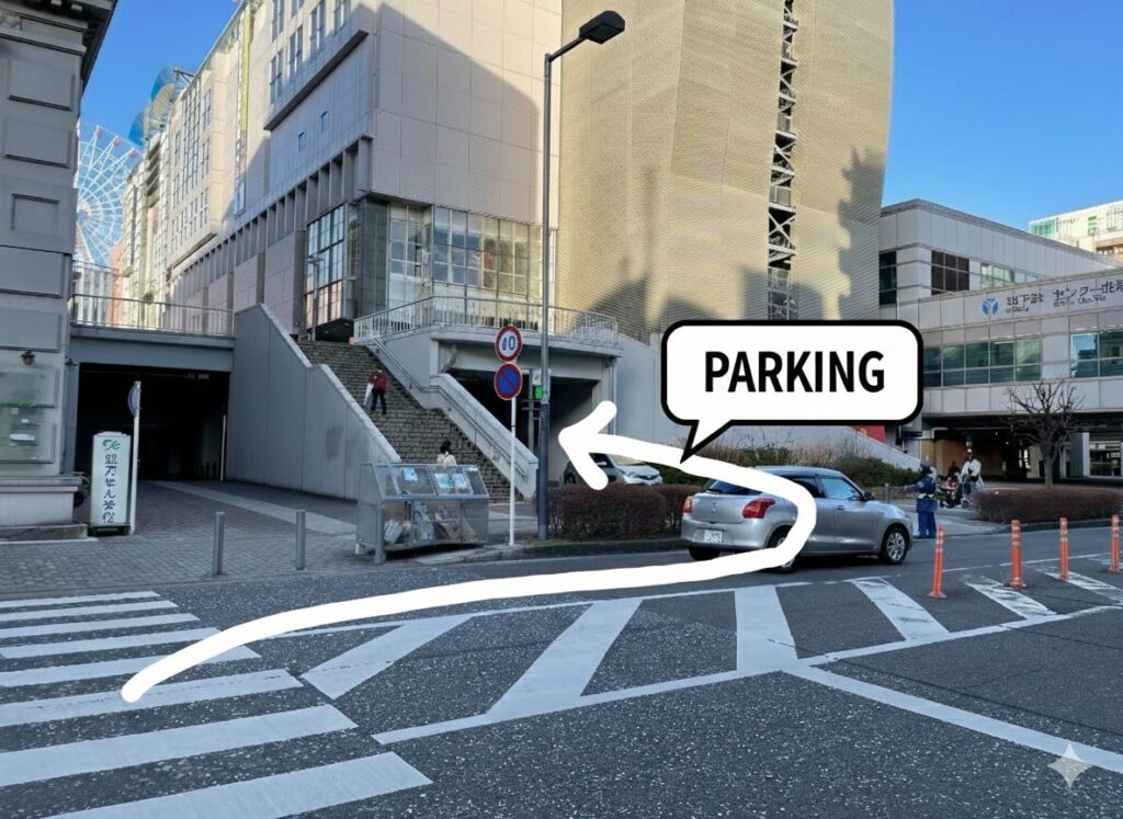 実際の風景では、シルバーの車が曲がっていく方向、階段横のエリアが入り口となっております。駅チカで雨の日も濡れずに当スタジオや駅ビルに移動できる便利な駐車場を、ぜひ日々のお買い物とスタジオ利用でお得にご利用ください。